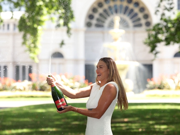 Dressed in a mid-length white dress, a bright-eyed Sabalenka posed with her coveted trophy and sprayed champagne outside the Royal Exhibition Building, Carlton Gardens.