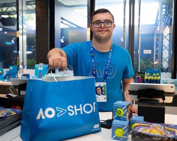 Jack Williamson on duty at the AO shop. [Liz Vagg/Tennis Australia]